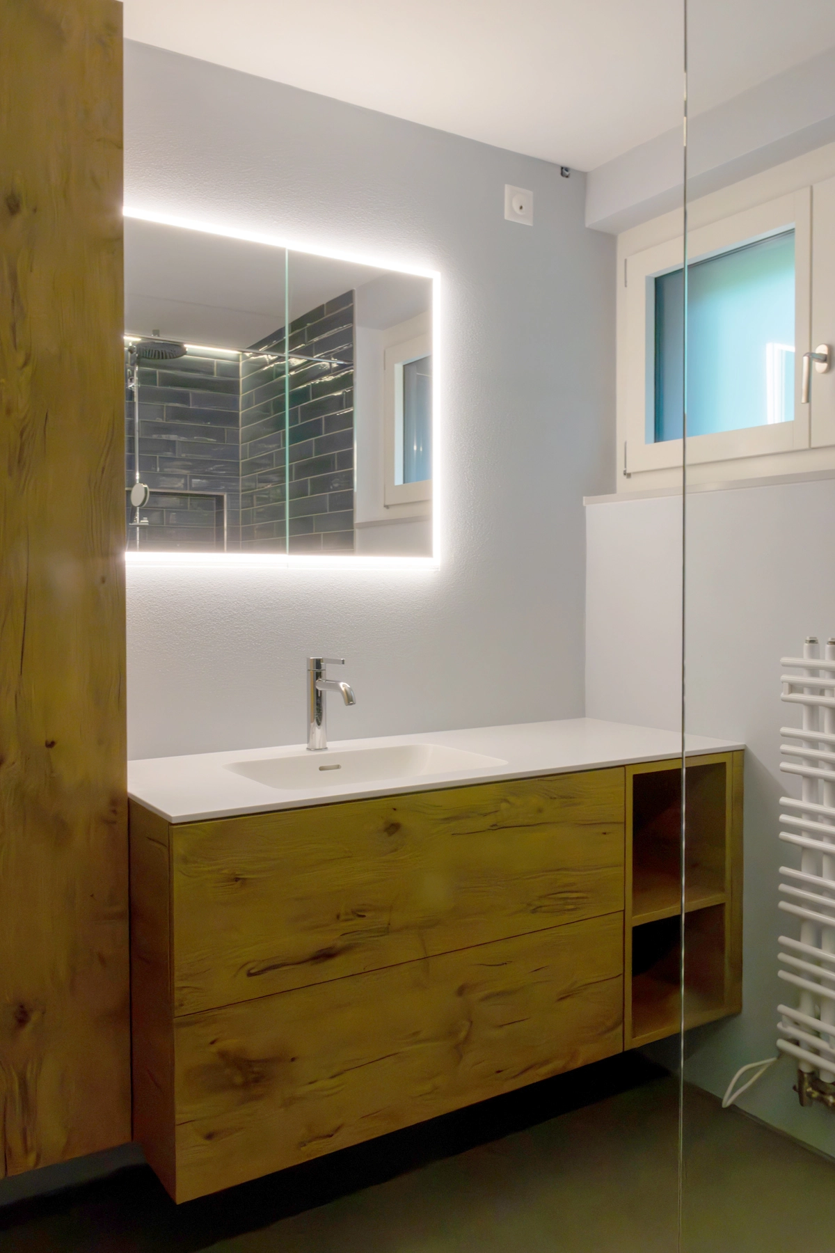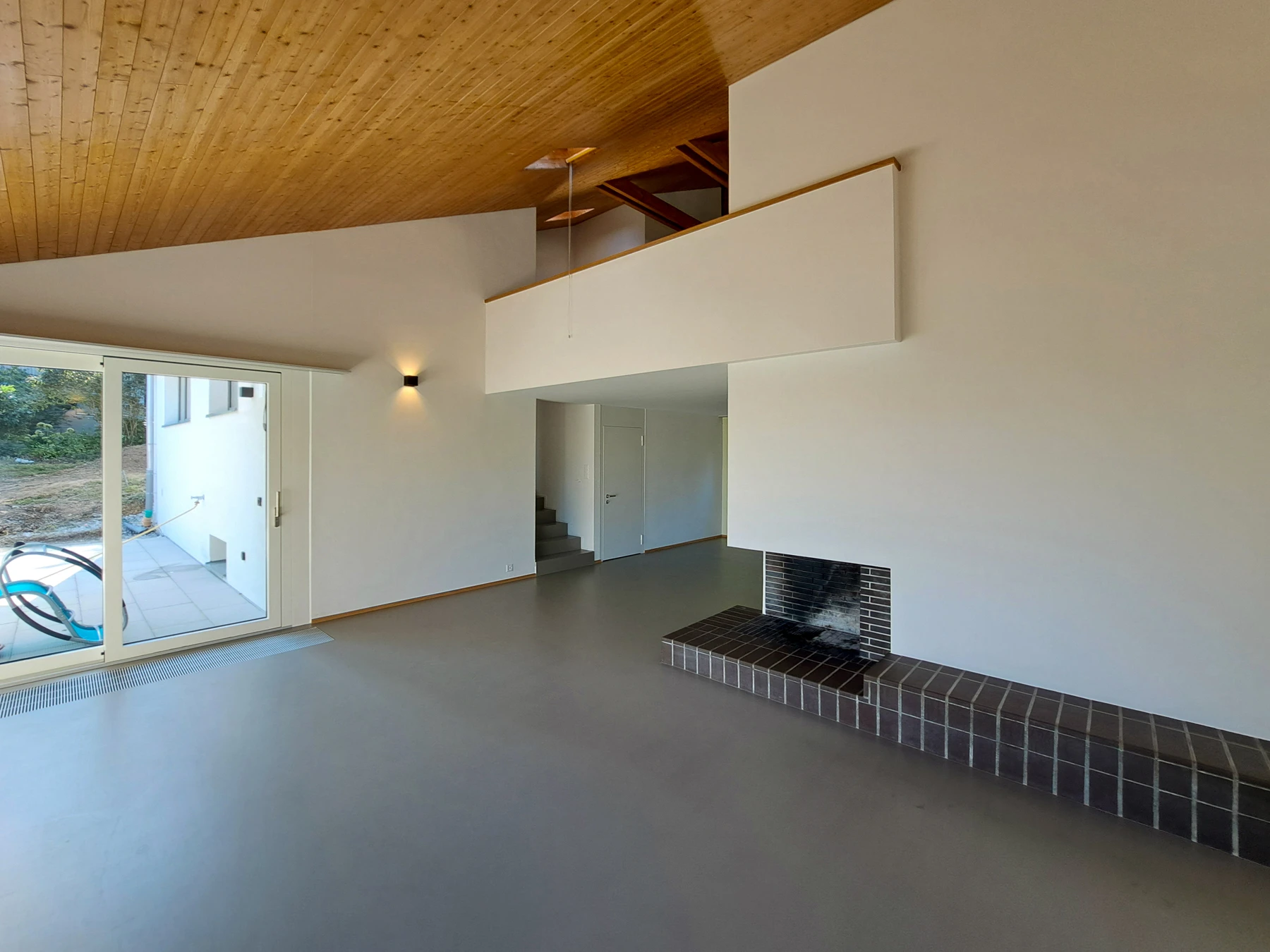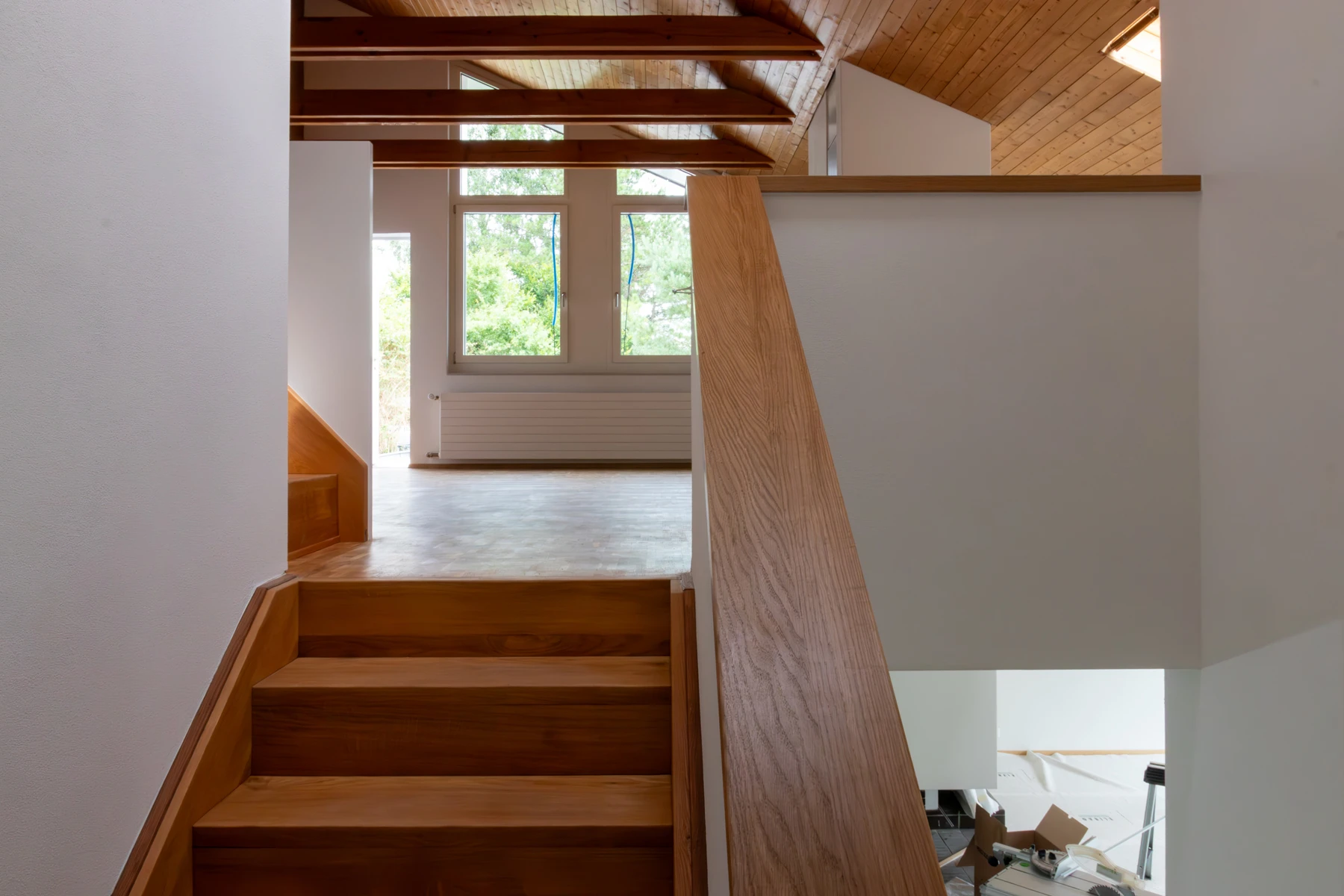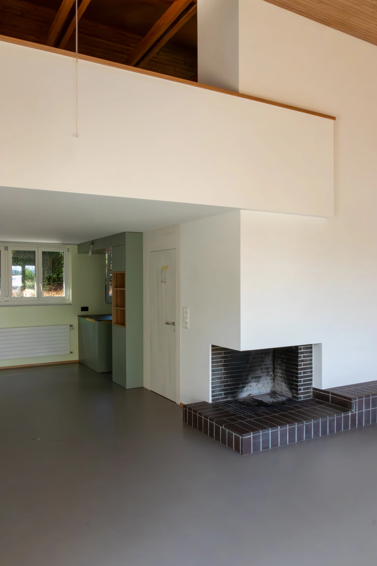 Ein zentraler Eingriff war die Öffnung der Küche zum Essbereich. Dadurch wurde der bereits grosszügige Wohnraum mit Galerie zusätzlich erweitert. Die bestehende Ölheizung wurde durch eine moderne Luft-Wasser-Wärmepumpe ersetzt – so konnte der frühere Tankraum in einen neuen Hobbyraum umgewandelt werden.