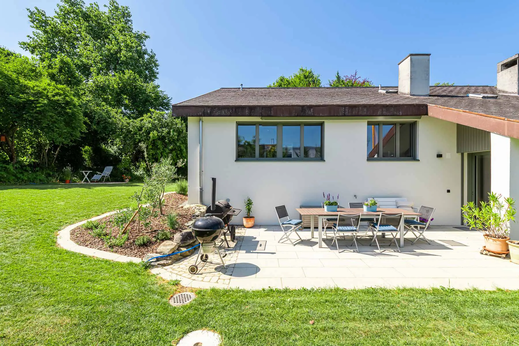 Abgerundet wird das Gesamtkonzept durch eine überarbeitete Gartenanlage mit neuer Bepflanzung und grosszügig gestalteten Sitzplätzen. So präsentiert sich das Haus heute in neuem Glanz – bereit für viele weitere Jahrzehnte stilvollen Wohnens.