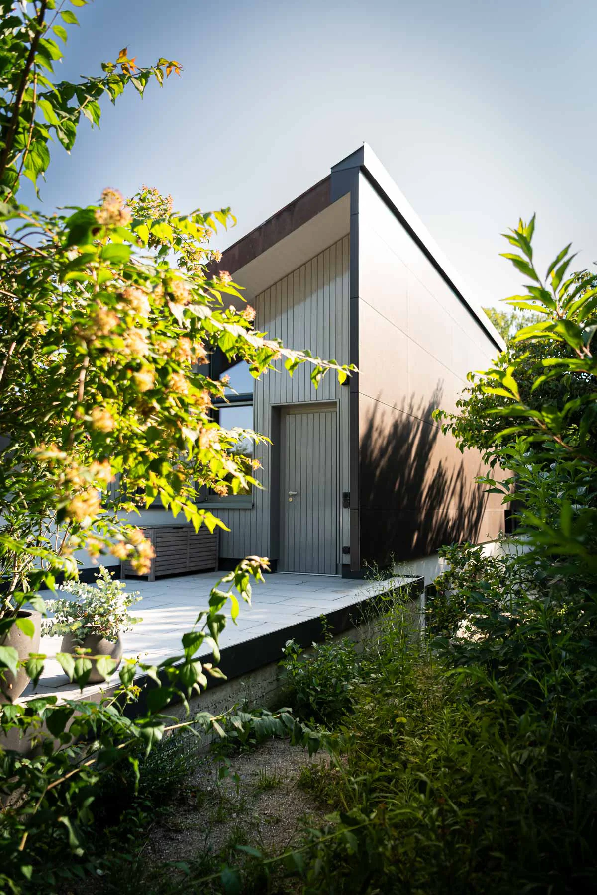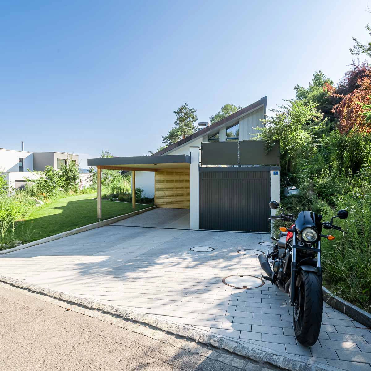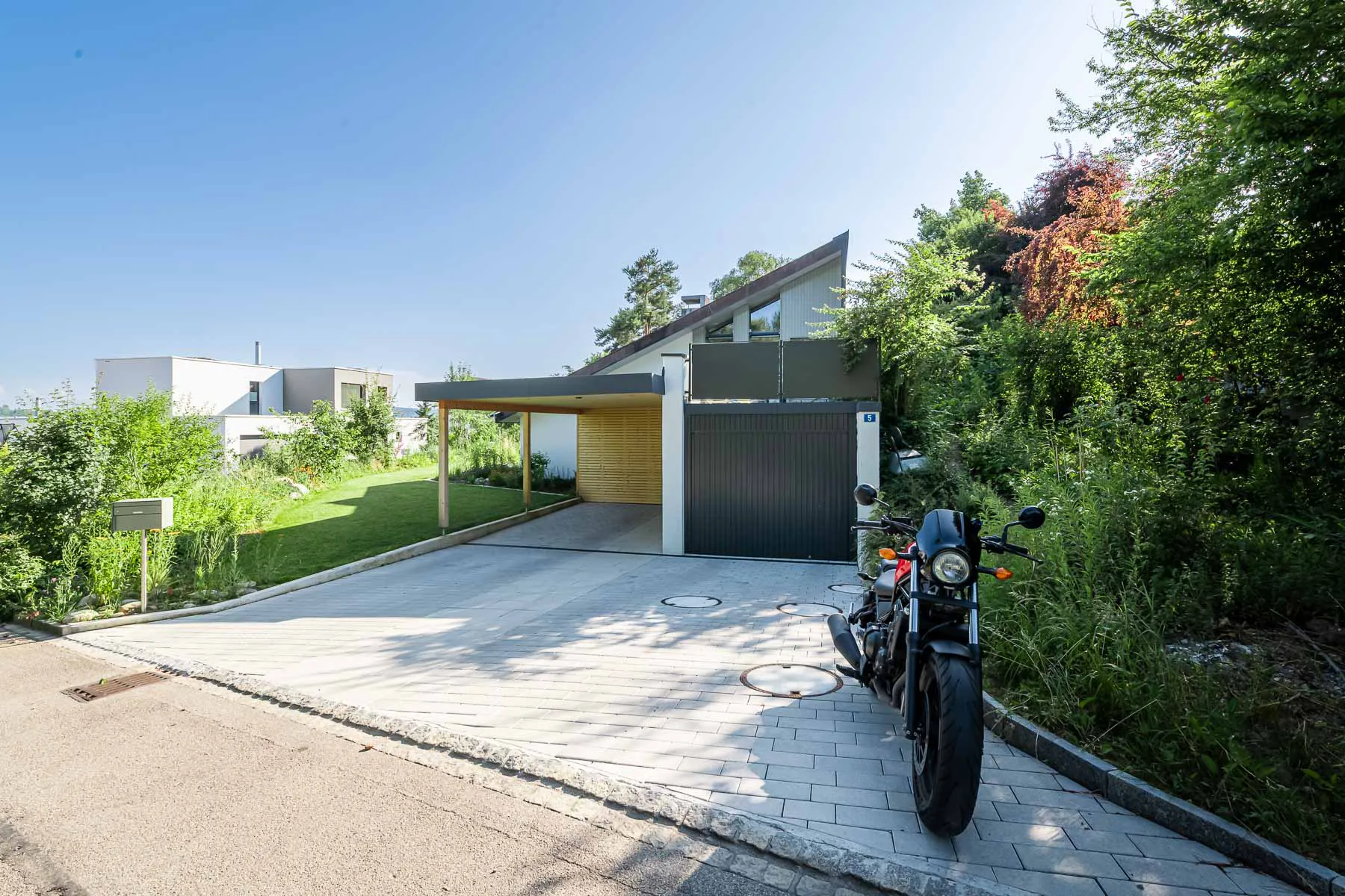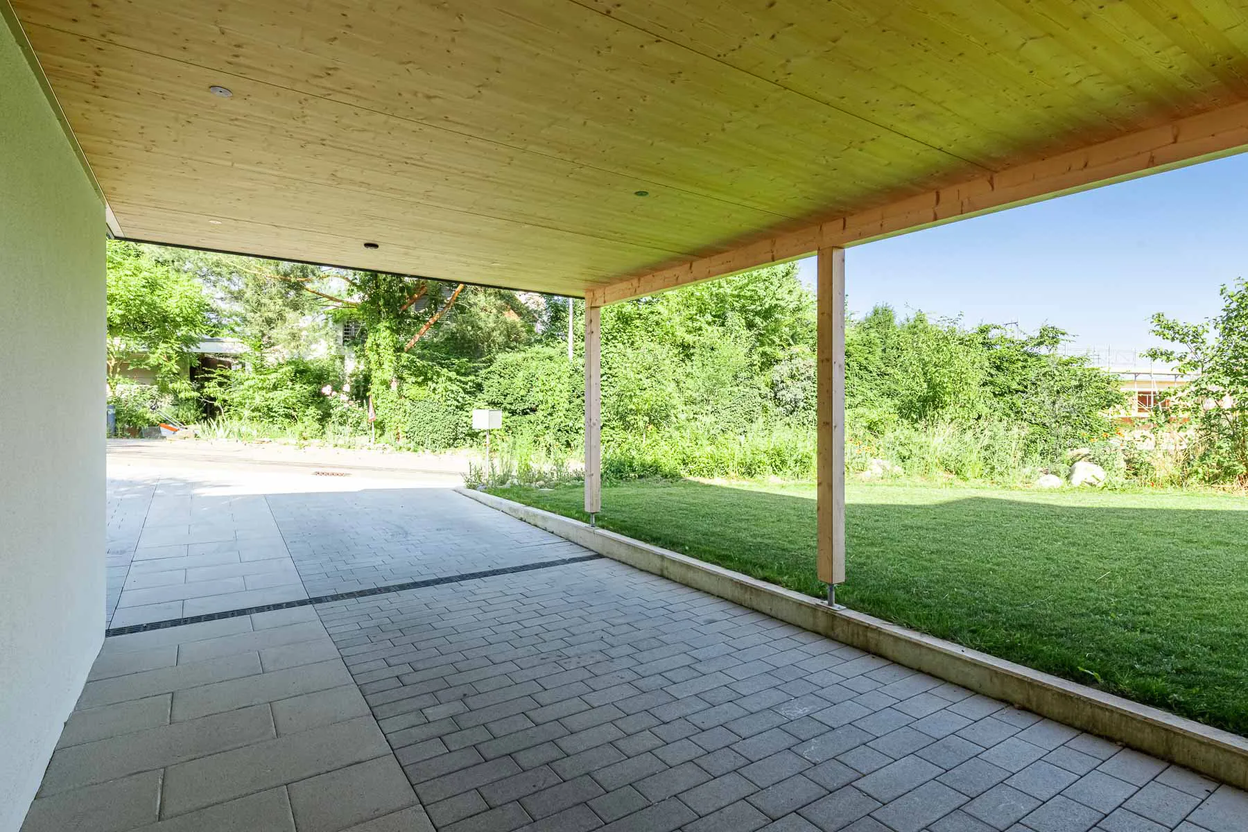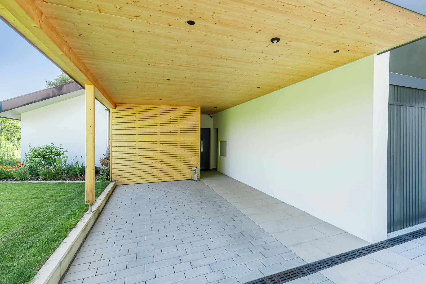 Neben der vollständigen Erneuerung der Haustechnik wurden sämtliche Oberflächen im Wohnbereich aufgefrischt und mit hochwertigen Einbauten ergänzt. Ebenso wurde der Eingangsbereich neugestaltet: Ein moderner Carport mit integriertem Geräteschopf bietet nun geschützten Zugang zum Haus und fügt sich harmonisch in die bestehende Architektur ein.